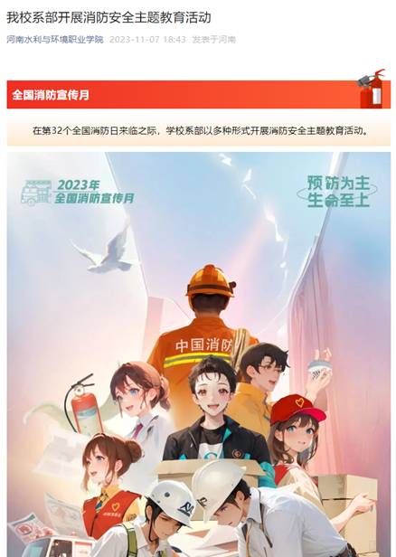 学校利用微信公众号等平台,以安全消防月为主题,普及防火措施、如何使用灭火器等安全消防知识,进一步增加了我校师生消防安全常识。通过宣传教育,全校师生学习掌握了消防知识,增加了防范意识,从而树立了“居安思危、有备无患”的消防观念。